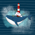 Der Walleuchtturm kommt hier vor Meeresblau mit weißen Wellenlinien auf hochwertigem Bio-Jersey.